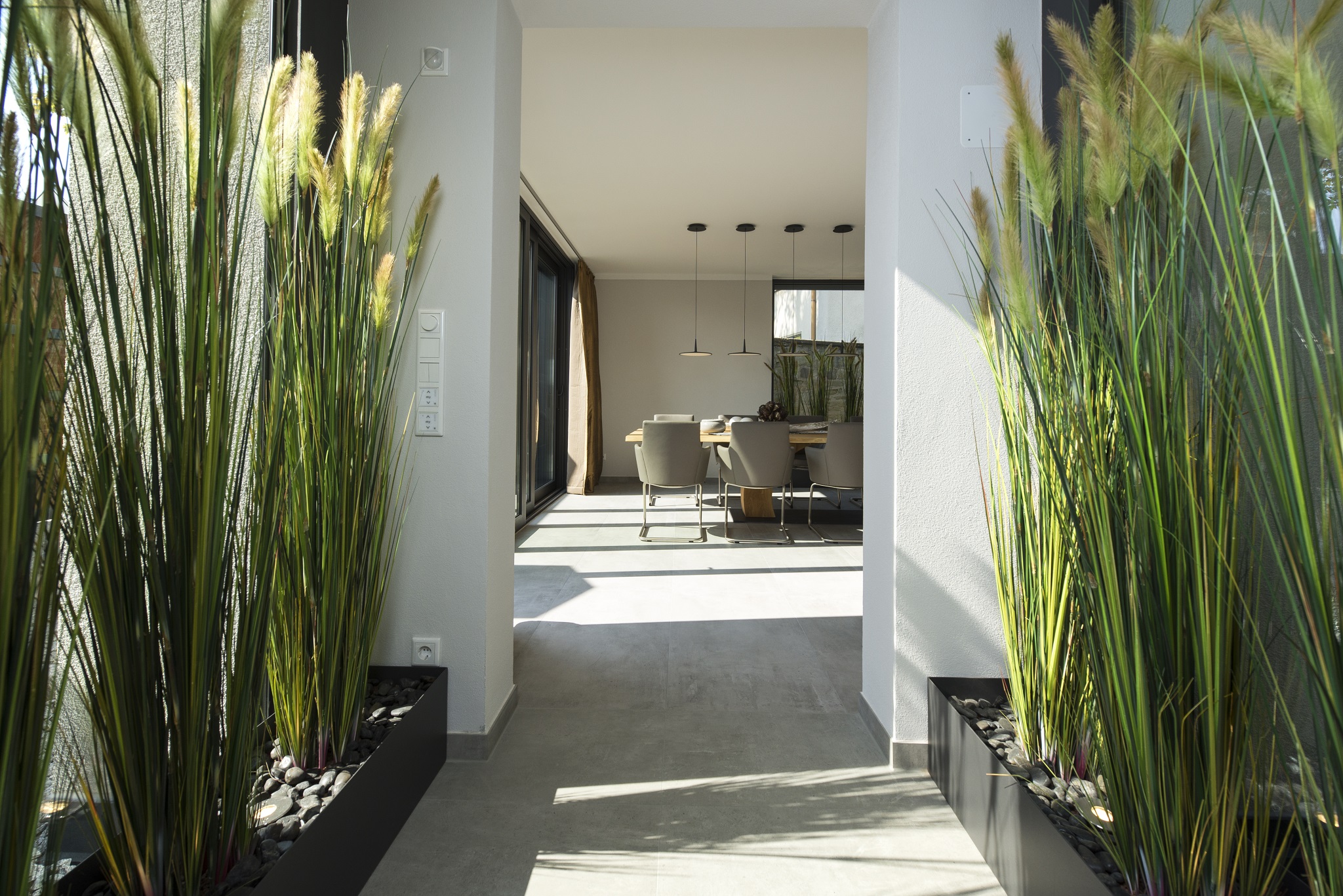 Astrid Fuchs erstellt für ein Haus aus dem Jahr 1840, das u.a. sogar schon als Gefängnis diente, eine Grundrissplanung. Eine Hälfte des Erdgeschosses wurde komplett neu geplant und mit einem Handwerkerteam des Kunden umgesetzt. Es stand neben dem Altbau eine Garten-Freifläche zur Verfügung. tRÄUME plante einen kubischen Anbau im Bauhaus-Stil, der sich der Denkmalschutzfassade quasi unterordnet. Die Anbindung ans Haupthaus wurde mit einem schmalen Glasdurchgang geschaffen, der dezent mit XL-Gräsern und Lichtspots in Szene gesetzt wird.